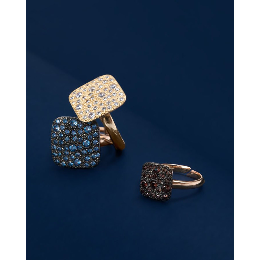 Anello medio (L20 mm) pavè in argento 925 di forma quadrata con uno studio  particolare di incassatura  mista, arricchito da pietre Tanzanite taglio  brillante. Gambo regolabile per adattarlo alla tua misura.