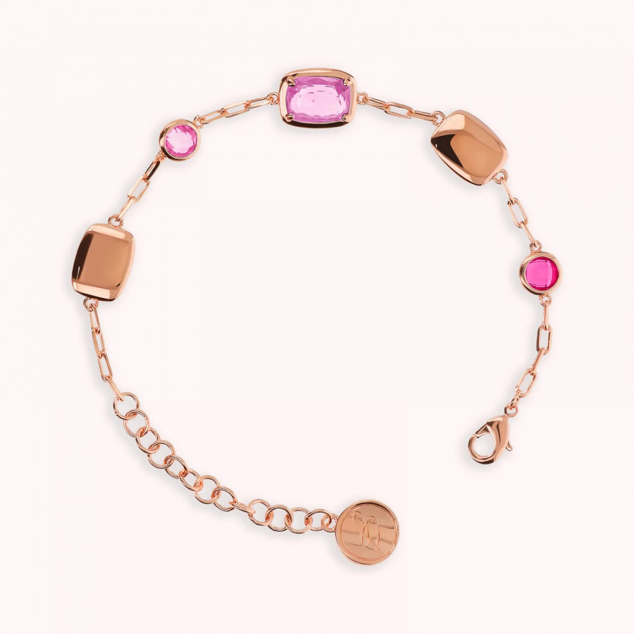 Bracciale Bronzallure realizzato in lega Golden Rosé, placcata Oro rosa 18kt, con catena forzatina impreziosita da pepite lucide rettangolari (11x8 mm) alternate a prisma gem tonde (6 mm) e a baguette (11x8 mm). Lunghezza 17+4 cm di estensione. Chiusura a moschettone.