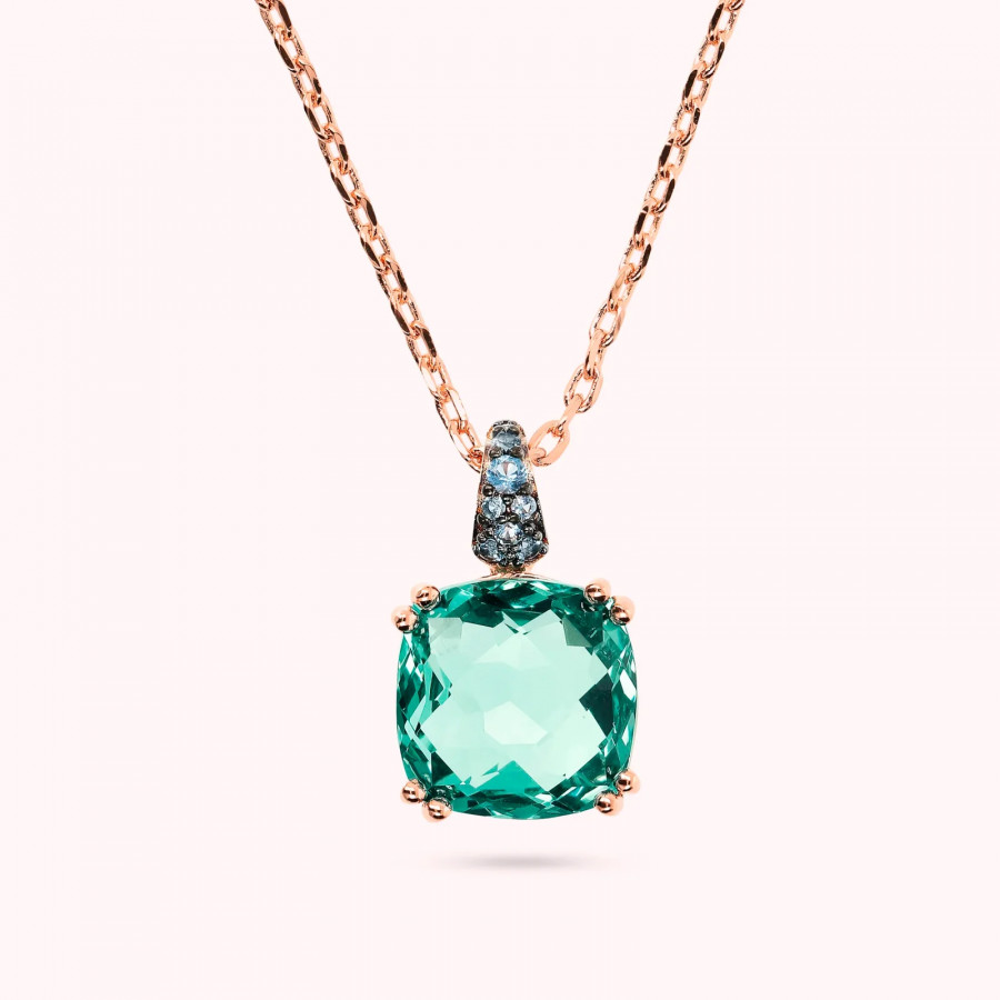 Collana Bronzallure realizzata in lega Golden Rosé, placcata oro rosa 18kt, con catena rolo impreziosita da una contro-maglia pavé e da un pendente quadrato in prisma gem (12x12 mm). Chiusura a moschettone con estensione.