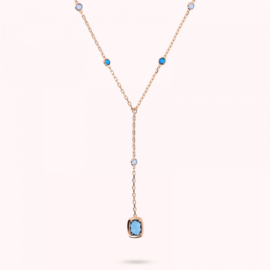 Collana Bronzallure lunga realizzata in lega Golden Rosé, placcata Oro rosa 18kt, con catena forzatina impreziosita da pepite lucide rettangolari (11x8 mm) alternate a pietre prisma gem tonde (4.5 mm) e a baguette (11x8 mm). Lunghezza 38+8 cm di drop. Chiusura a moschettone con estensione di 5cm.