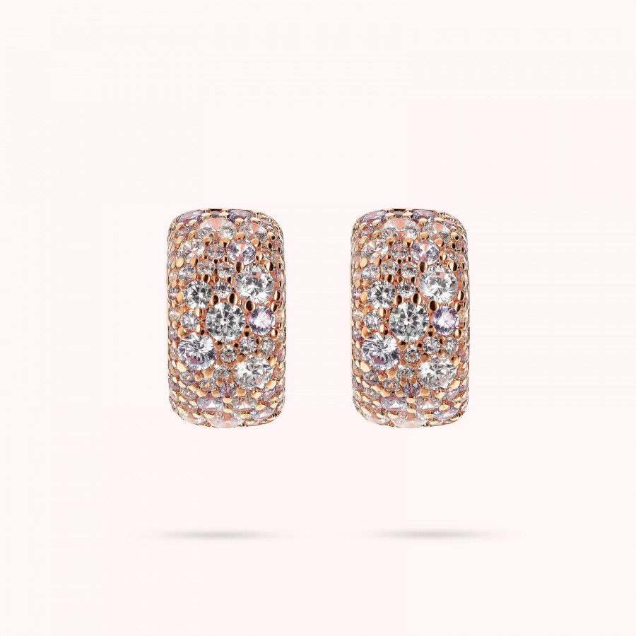 Orecchini Bronzallure a cerchio realizzati in lega Golden Rosé, placcata Oro rosa 18kt, con superficie in pavé misto di cubic zirconia, qualità luminosa (1.25 / 2 / 2.75 mm). Chiusura con perno a incastro. Diametro esterno 1.5 cm.