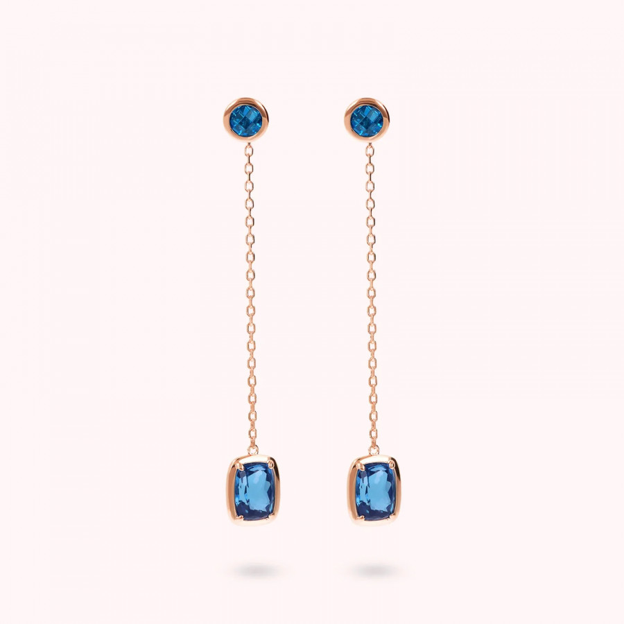 Orecchini Bronzallure pendenti realizzati in lega Golden Rosé, placcata Oro rosa 18kt, con contro-maglia in prisma gem tonda (6 mm) dalla quale pende un filo di catena rolo con prisma gem a baguette finale (11x8 mm). Lunghezza 8 cm. Chiusura a perno e farfalla.