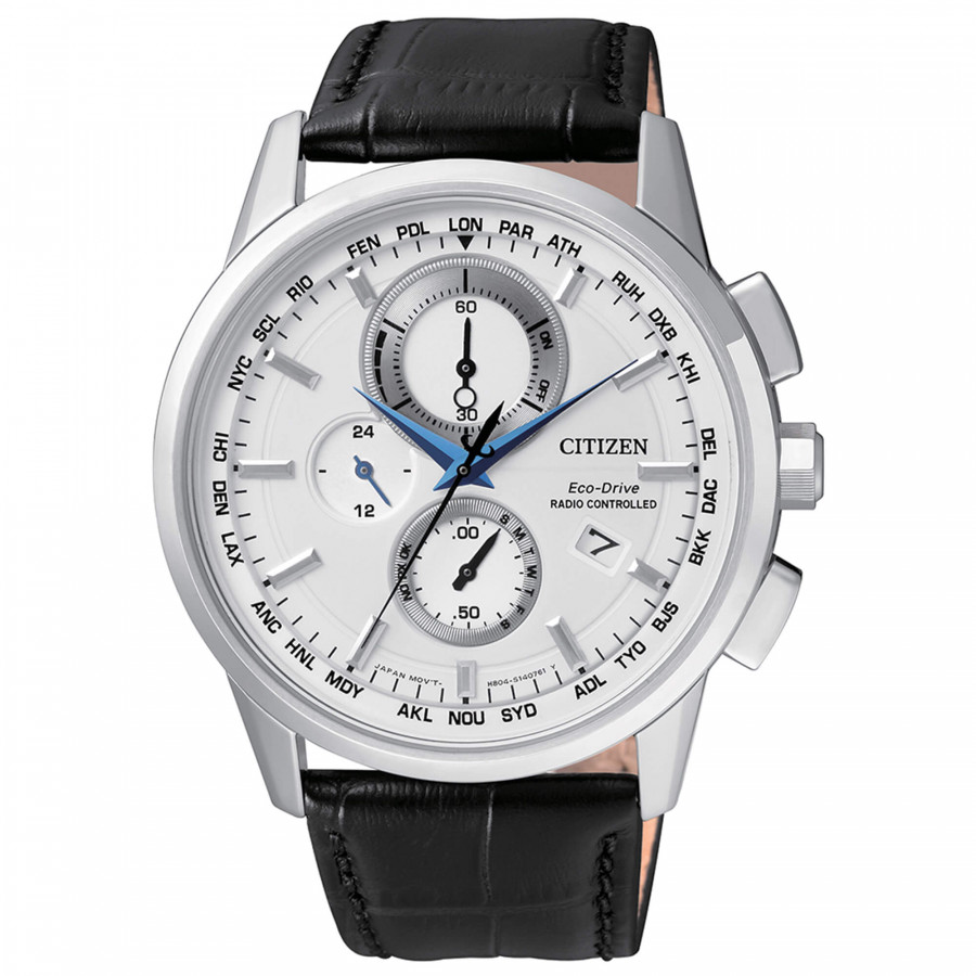 Orologio da uomo cronografo a 1/5 di sec. Eco-Drive (a carica luce infinita) con riserva di carica di 2 anni. Radiocontrollato a 5 canali: ricezione segnale orario USA, Europa, Giappone, Cina. World time con orario di 26 città del mondo e ora UTC. Calendario perpetuo. Cassa in acciaio, cinturino in morbida pelle. Vetro zaffiro. Quadrante analogico bianco WR 10 bar. Diametro cassa 43 mm.