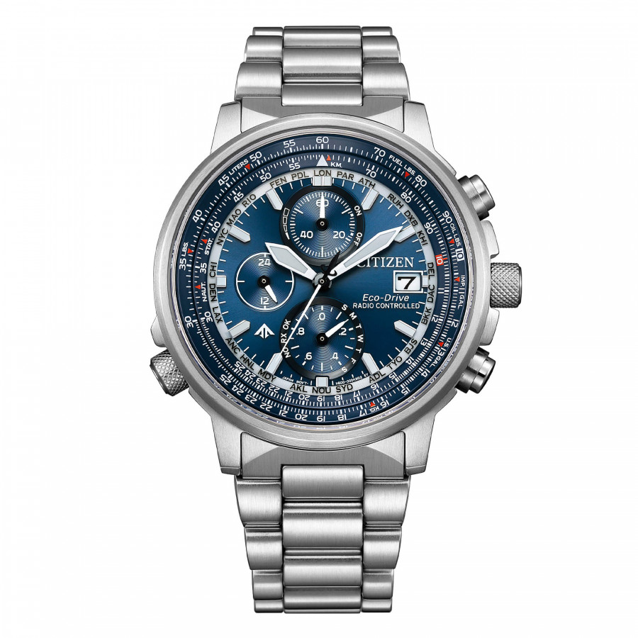 Orologio da uomo radiocontrollato cronografo Eco-Drive a carica luce con riserva di carica di 10 mesi e indicatore livello di carica sul quadrante. Cassa in acciaio con regolo calcolatore di tipo aereonautico, bracciale in acciaio, quadrante analogico blue. Vetro zaffiro. WR 20 bar. Funzioni Radiocontrollato a 5 canali: ricezione segnale orario USA, Europa, Giappone, Cina. World time con orario di 26 città del mondo e ora UTC. Cronografo a 1/20 di sec. Calendario perpetuo. Diametro cassa 41 mm
