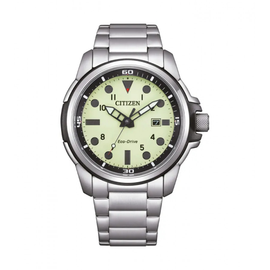 Orologio da uomo con movimento Eco Drive calibro J810 con riserva di carica di 240 giorni, solo tempo e data. Cassa in acciaio da 44 mm con finiti, fondo serrato a vite e corona protetta. Vetro minerale. Quadrante full lume, con lancette luminescenti. Datario a ore 3. Bracciale in acciaio con chiusura di sicurezza a pulsante. WR 10 bar.
