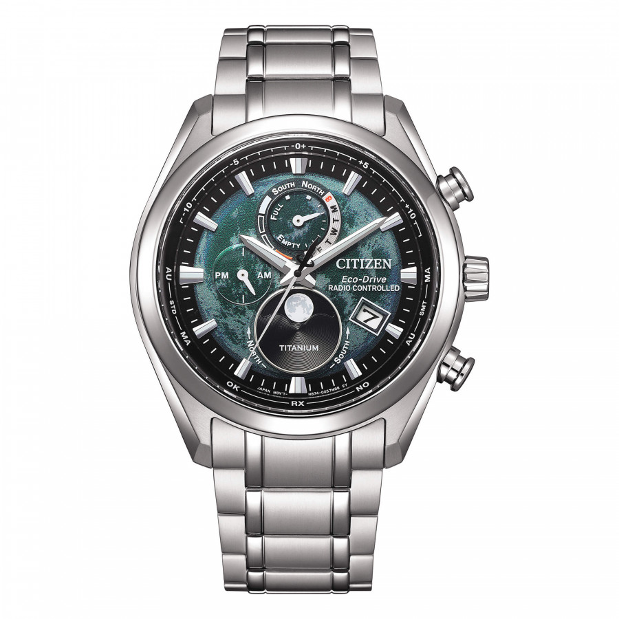 Orologio da uomo Eco-Drive a carica luce radiocontrollato con riserva di carica 2,5 anni. World time. Fasi lunari e calendario perpetuo. Cassa e bracciale in Super Titanio. Fondello personalizzata con incisione 24 fusi orari. Quadrante analogico verde. Vetro zaffiro con trattamento antiriflesso. Wr 10 bar. Diametro cassa 43 mm.