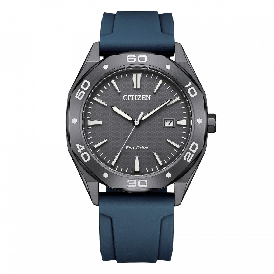 Orologio solotempo con movimento Eco Drive a carica luce con riserva di carica di 180 giorni. Cassa in acciaio con trattamento gray IP. Fondo serrato a vite. Cinturino in poliuretano con chiusura di sicurezza a pulsante. Resistenza all'acqua WR 10 bar. Diametro cassa 41 mm. Finitura cassa Grey, Vetro Minerale, Cinturino in Caucciù Blue, quadrante Analogico colore Nero. Peso (gr) 84,00