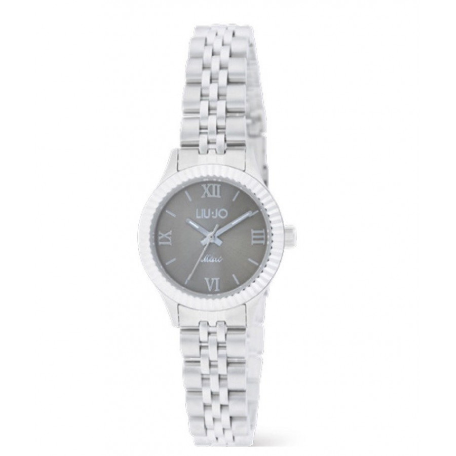 Orologio da donna solotempo con cassa e bracciale in acciaio del diametro di 26 mm e quadrante analogico grigio con indici romani silver. Numeri romani al 12, 3, 6 e 9. La resistenza all'acqua è di 5 atm e il movimento al quarzo di tipo Miyota cal. 2035. Vetro minerale.