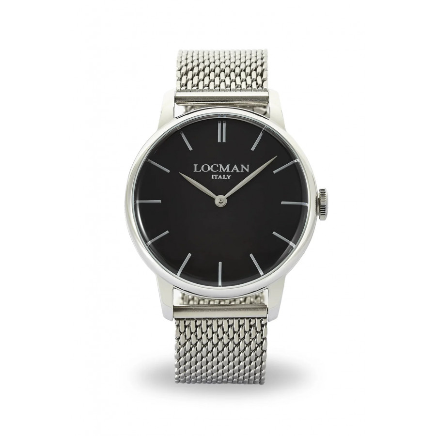 Orologio Locman con movimento al quarzo Miyota, cassa in acciaio inossidabile da 42 mm, quadrante nero con indici applicati color nichel, larghezza anse 20 mm, cinturino in acciaio maglia Milano, vetro zaffiro antiriflesso, resistenza all'acqua fino a 5 atm.