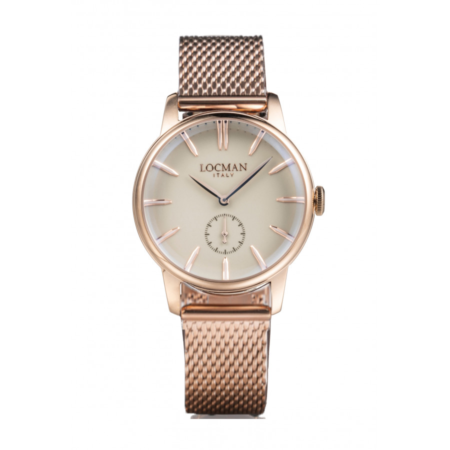 Orologio Locman solotempo con movimento al quarzo Miyota, cassa in acciaio inossidabile PVD oro rosa da 42 mm, quadrante avorio con indici applicati color acciaio PVD oro rosa, cinturino in acciaio maglia Milano, vetro zaffiro antiriflesso, resistenza all'acqua fino a 5 atm.