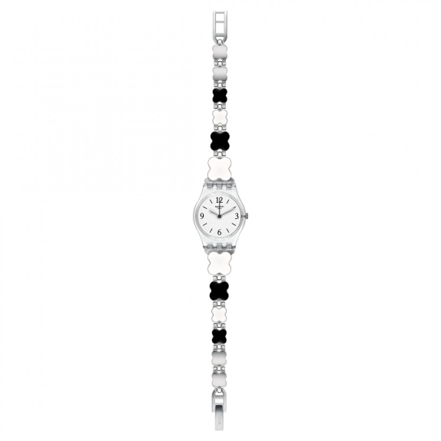 Quadrante bianco con indici neri alloggiato in una cassa in plastica trasparente lucida. Cinturino regolabile in acciaio inossidabile lucidato con maglie in resina bianca e nera e attacchi in acciaio inossidabile lucidato con resina bianca.
